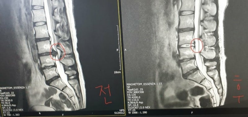 또 다른 환자는 수술 후 MRI를 통해 허리 상태가 개선된 것을 확인했어요. 수술 전과 후의 MRI를 비교해보면, 문제가 있었던 디스크가 제거된 것을 볼 수 있어요.